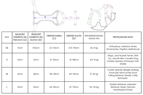 Szelki podszyte są miękką siatką dystansową, która zapewnia odpowiednią cyrkulację powietrza, minimalizując ryzyko przegrzania i otarć. Dopasowany krój sprawia, że szelki nie przekręcają się i nie powodują ucisku, co zapewnia maksymalny komfort nawet podczas długich spacerów.